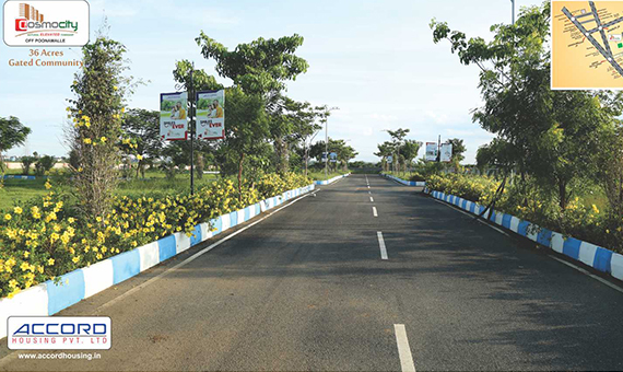 Cosmo City South in Poonamallee, Chennai West by Accord Housing Builders is a residential project. The project offers Land with perfect combination of contemporary architecture and features to provide comfortable living. The project is spread over a total area of 9 acres of land. An accommodation of 150 units has been provided. Cosmocity enjoys truly unique location, with close proximity to all essentials including schools, transport, shopping, hospitals etc, yet in a calm serene pollution free environment.